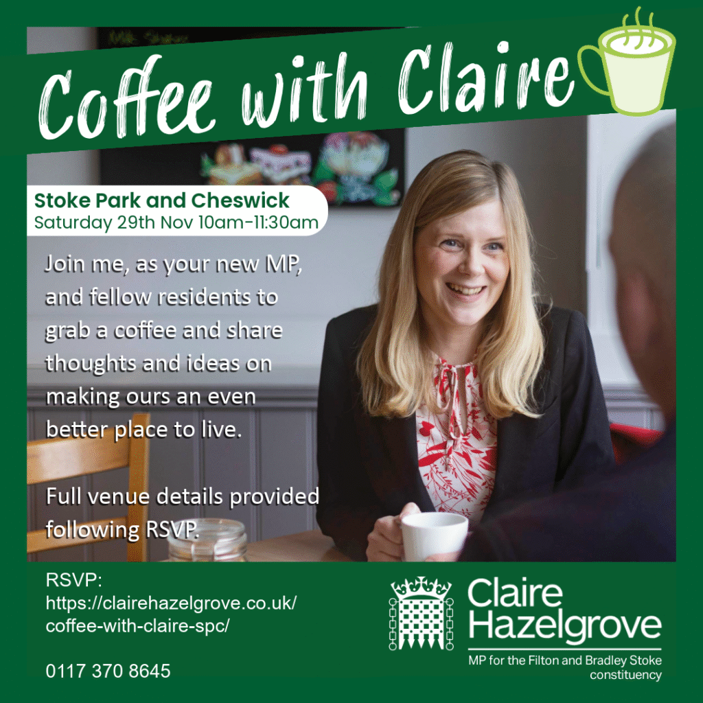 I’ll move these around to different parts of our constituency throughout the year, which helps each to be a very local conversation. Sign up below to join me in Charlton Hayes and Cribbs.
