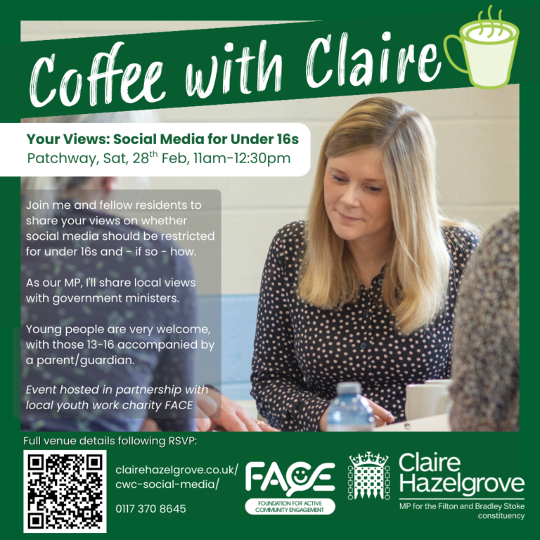 The event will be in Patchway (venue following RSVP) on Saturday 28th February, 11am-12.30pm, and is open to all across our Filton and Bradley Stoke constituency.